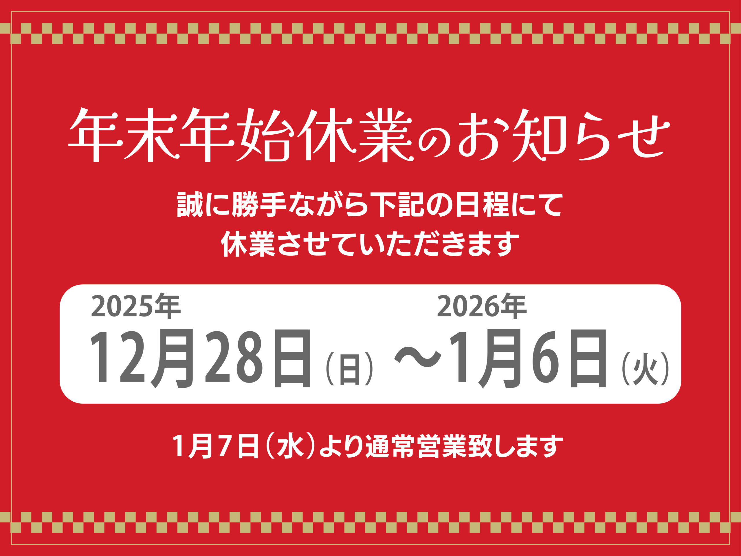 年末年始休業中のお問い合わせにつきましては、休業期間後の回答とさせていただきます。